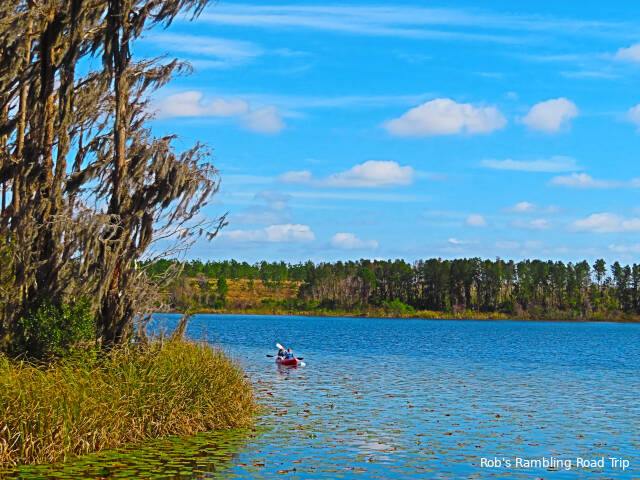 My exercise level today was reduced from yesterday’s. Somewhere along the way yesterday I must have twisted my leg or something. While walking today, my knee wasn’t as happy as it should be. It wasn’t bad, just annoying. My walks were restricted to the campground. I walked over to the fishing piers on the two lakes a couple of times today. There were plenty of people trying their luck at fishing and renting kayaks to explore the lake.