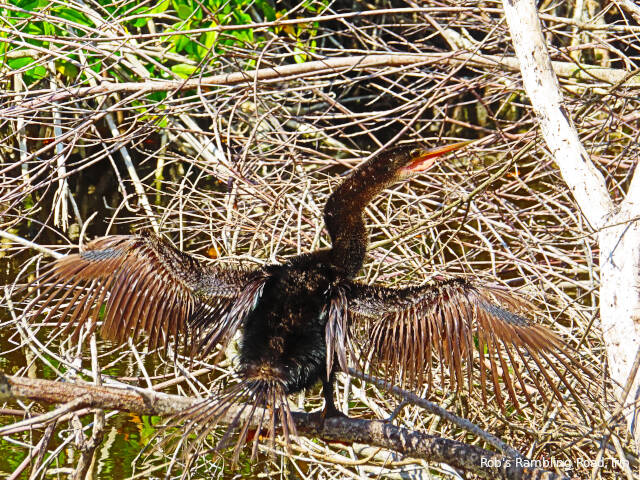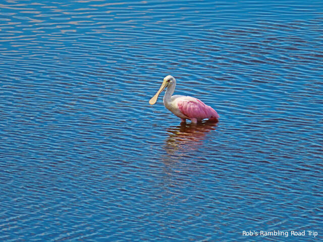 On the way back I stopped at the Marsh trail of the Ten Thousand Islands National Wildlife refuge again. Yesterday I walked the whole three mile round trip out the trail and back. Today I only walked a short way to the observation tower. The majority of the wildlife are in that part of the trail. Today the Rosetta Spoonbills were hanging out in front of the observation tower.