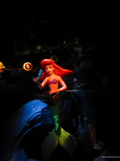 Crowds were much better today than Monday. The wait times were all significantly less. I got to ride some of the more popular rides with reasonable wait times. Peter Pans Flight was listed at 50 minutes, but was a bit less. Haunted Mansion was thirty minutes. Buzz Lightyear Space Ranger Spin was twenty minutes early in the evening and only ten just before the fireworks, so I rode it twice. The Journey of the Little Mermaid was listed at twenty minutes, but it was a walk on. Walking the entire length of the queue without stopping took more than a couple of minutes, but it was a lot shorter than twenty minutes.