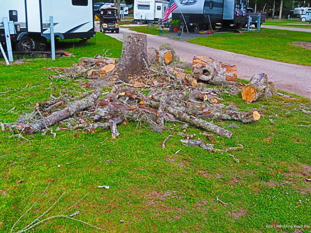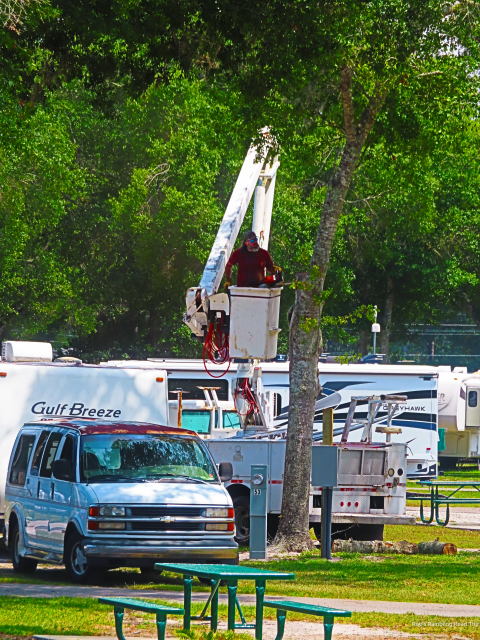I’ve seen tree work in campgrounds quiet a few times in the course of my Rambling Road Trip. One reason is that the trees need to be kept cut high enough to allow thirteen and fourteen foot clearance motorhomes and fifth wheel trailers to pass under. The park also needs to make sure that old or damaged trees don’t fall on equipment or worst yet people. The most elaborate tree work I have seen in a campground was last February in Fort Wilderness. The staff closed two sites for two nights to provide plenty of time for a service to cut down a tree that was more than three feet in diameter. In addition to bucket trucks one of the tree service workers free climbed part of the tree with spikes and straps. I wasn’t there when the big sections came down, but I bet it made a bit of noise. Everything was cleaned up and gone by the time I returned from the theme parks that night.