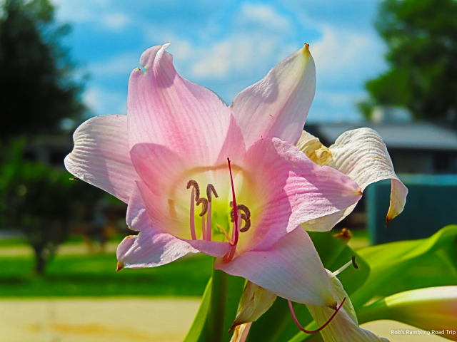 • I think you’re correct on it being a lily. It seems to be an abandoned plant here at the RV park. There is another blossom getting ready to open. I’ll try and get a picture of that one. It is a very pretty mix of color with the white.