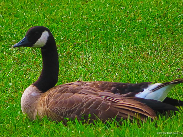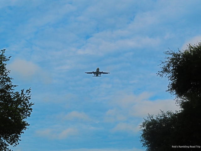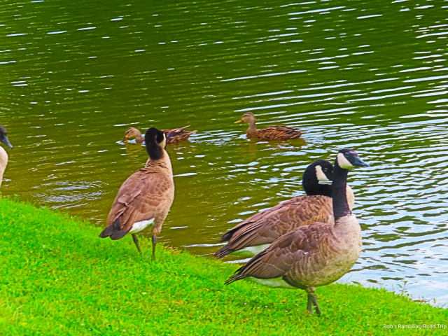 The rain stopped and the sun made a brief appearance after 6PM. I got out for my only walk of the day. There was a lot of dodging puddles involved in the walk around the front section of the RV park. The 6PM hour is one of the times during the day that a steady stream of landing aircraft are passing overhead. When you are outside it is impossible to ignore the noise of the passing planes. Tonight was no exception. At least five went by during my walk. The geese were plentiful along the bank of the retention pond. They were huddled in two different groups. The ducks were taking refuge with one of the groups of geese.