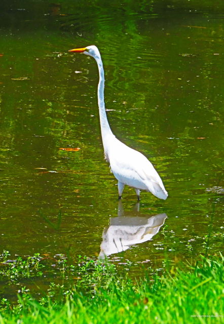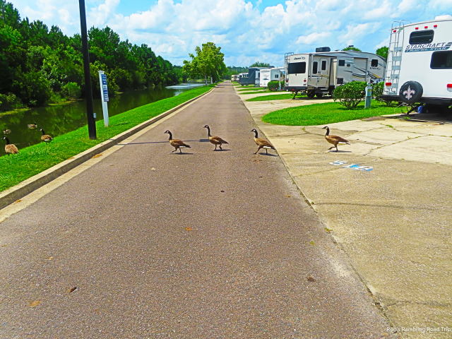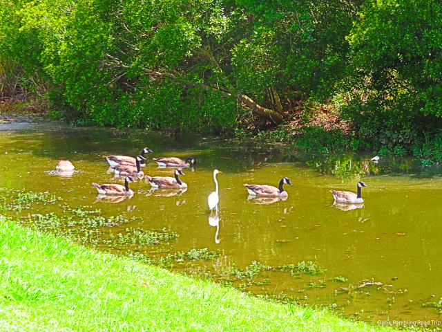 The weather didn’t keep me from resuming my twice daily walks around the RV park. My first walk was in the morning, but the second had to wait until the potentially sever line of storms passed through this area. The rain was very loud on the roof for close to an hour. The geese had a new friend this morning. An Egret was proudly standing in the middle of their flock. On my second walk after the rain the geese and egret were gone, but the pair of ducks remained.