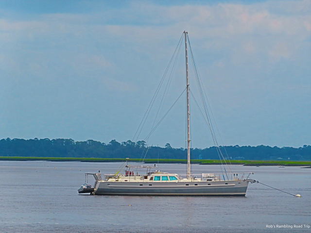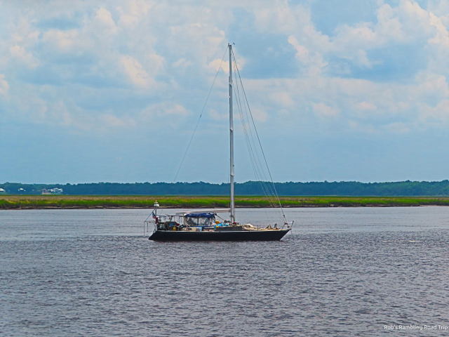 I made it north to St Mary’s Georgia today. Gas was about fifteen cents a gallon cheaper and the walk along the river was enjoyable. There was a little more breeze along the river so the heat didn’t feel as bad. All of the mooring balls I could see in the river were filled with big sailboats and it looked like there were several on anchor lines at the edge of the mooring area. Some of the boats were impressive. The temporary landing area was filled with dinghies. The restaurants and shops looked busy.