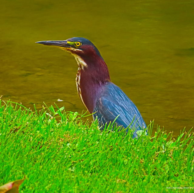 The knowledge that thunderstorms would arrived soon was the catalyst to get me moving. The sun was visible through the clouds most of the morning, but as the afternoon progressed the cloud cover thickened. My only walk around the RV park was under overcast skies. The temperature was around the ninety degree mark and it was humid. The geese were hiding out somewhere else this afternoon. The Green hereon that usually takes off long before I can get my camera up was more accommodating today. I was able to get a nice picture of the little hereon before it retreated from the near bank to the trees on the far bank. It is a very colorful bird.
