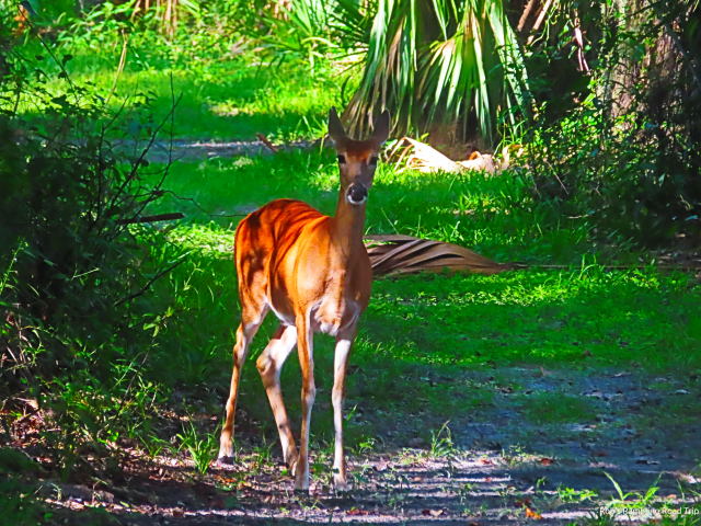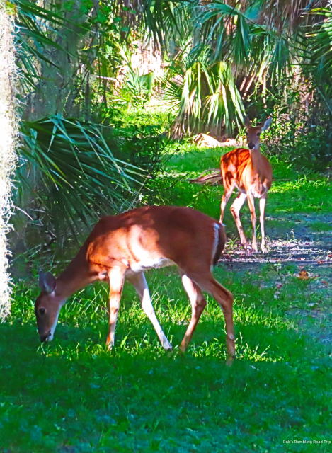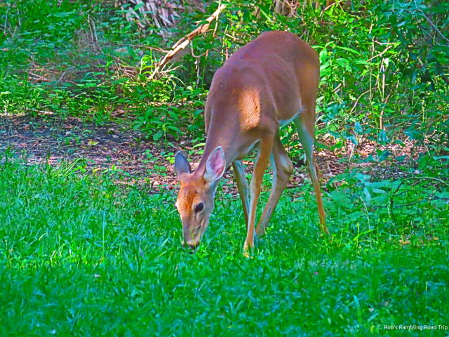 The thunderstorm with accompanying downpour that passed through here yesterday afternoon into evening made hiking difficult again. The puddles that had dried up enough to get around were once again blocking the trails today. I didn’t have any luck getting back away from the park roads. With all the traffic and weekend visitors, there weren’t a lot of wildlife viewing opportunities today. I got lucky late in the afternoon along the river near the front of the park. A couple of deer, probably the same ones I saw a few days ago, were blocking my path as I attempted to return to my RV home. I was able to stand less than fifty feet away taking pictures and waiting for them to move along. After about five minutes of watching them I decided to go around them via the picnic area between the deer and the road. My goal was not to spook them into bolting toward the road. If I walked straight toward them, that was their only real escape route. It sort of worked. I didn’t spook them, but something else did. Just after I got out of the empty picnic area the deer bolted out of the wooded area separating their original location from the picnic area. Luckily they decided the open ground of the picnic area was safe for a little grazing rather than continuing on into the road.