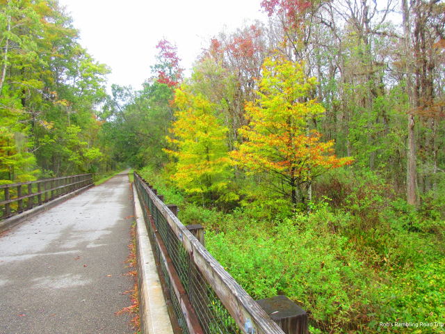 Most of the other users of the trail today were bicyclists. I only saw a couple of other walkers. On previous visits, I have passed a lot more walkers. Today’s cloud cover made the walk comfortable, but didn’t help highlight the foliage. For Florida, there was some nice color along the way. I also didn’t see any real land based wildlife. In the past I have seen deer, but not today.