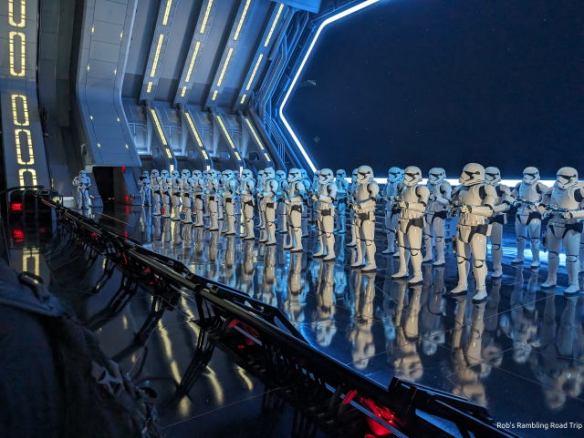 It is a very fun and immersive ride. The premise is your a recruit for the resistance being transported to a secret base. The First Order intercepts your transport and takes you prisoner on the first part of the attraction. On the second half of the ride you escape and return to safety. It is filled with interactions with actors and lots of technology. At the very end your ride vehicle enters a “escape pod” and becomes a motion simulator to get you back from space to land. I’m glad it was a very short motion simulator escape. A little longer and my dislike of motion simulators would have kicked in. Overall I really enjoyed the ride. That last part will lower my desire to ride it again. My threshold for waiting is probably down to thirty minutes.