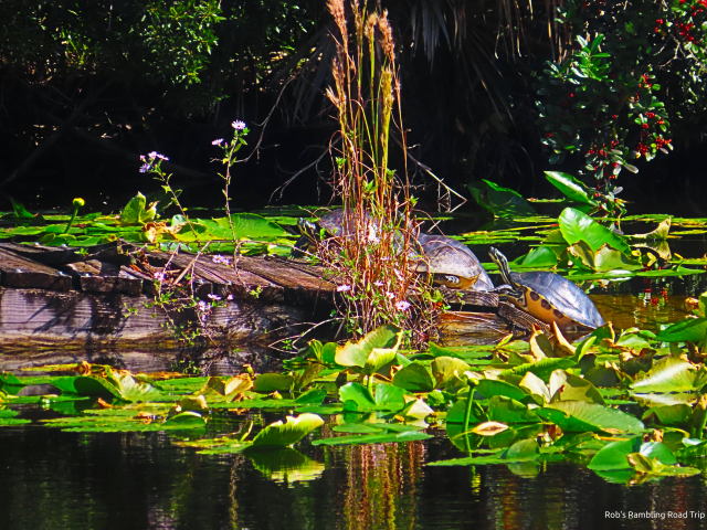 It was nice walking along the boardwalk. I saw a few turtles taking the sun in one of the ponds and several colorful wildflowers. Birds and larger mammals were all in hiding. The boardwalk is showing its age. Some of the boards are spongy and the foliage is creeping into the path. The water level under the boardwalk was also a little higher than usual.