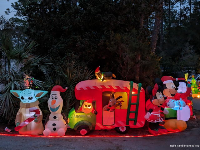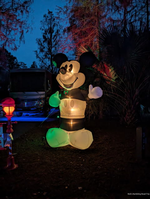 Today was the day for my much anticipated visit to Disney’s Fort Wilderness Campground to see how the campers have decorated their campsites. I try to do this every year I’m in the area. This year I combined the trip to the campground with an afternoon at Disney’ Magic Kingdom. The park closed at 6PM to allow for the separate admission Mickey’s Very Merry Christmas Party. I got there at about 1PM and escaped on the Launch to Fort Wilderness shortly after 5PM. The park was very crowed when I arrived and down right impossible to navigate when I departed. The Christmas party guests were allowed to enter at 4PM.