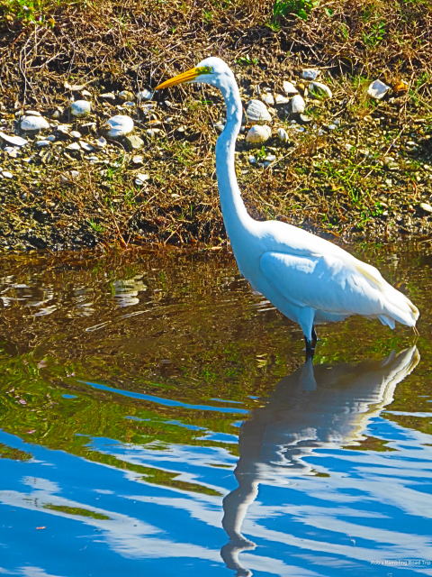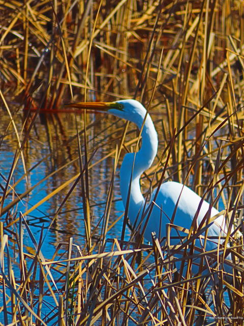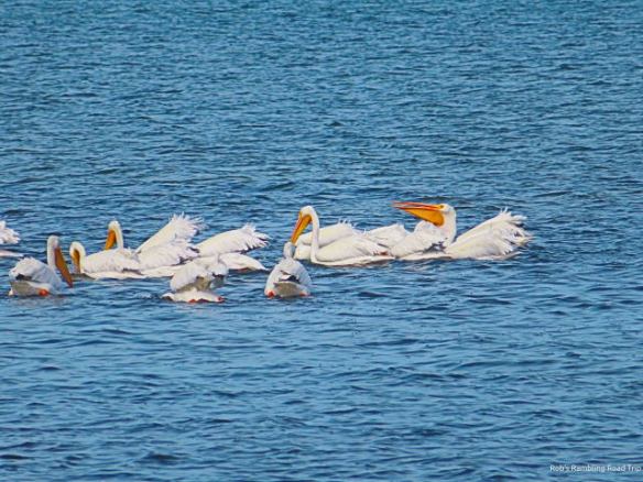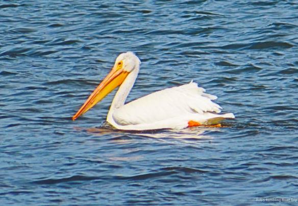 Walking along the boardwalk on the Tampa Bay side of the preserve I spotted a fleet of White Pelicans fishing in the partially protected waters along the edge of the bay. The White Pelican is a true snowbird. It doesn’t hang around Florida in the summer like its cousin the Brown Pelican. The White Pelican is bigger than the Brown and it doesn’t search for fish the same way. White Pelicans feed in a group called a fleet and heard or otherwise corral fish for easier picking. The Brown Pelican can typically be seen diving from high above the water to capture its food. The White Pelicans seem to be more stately and less energetic.