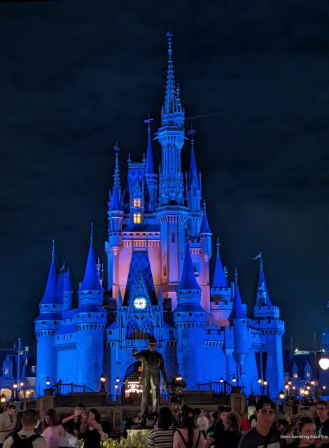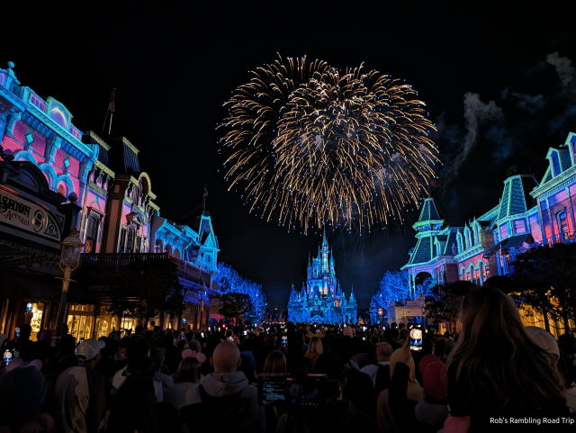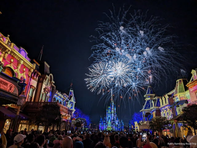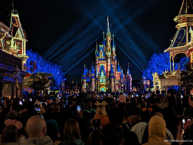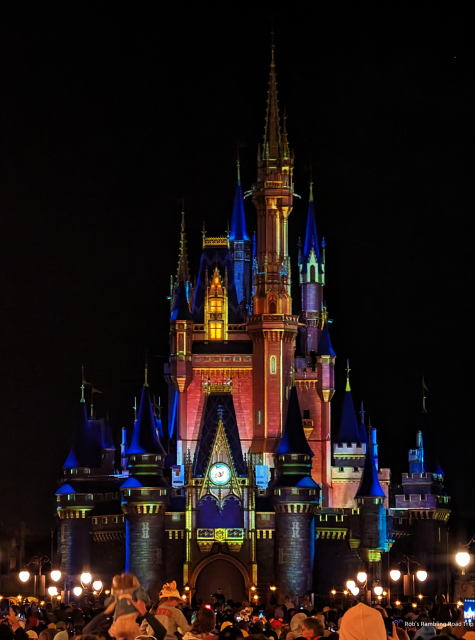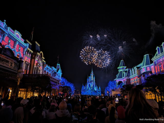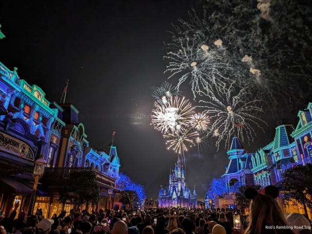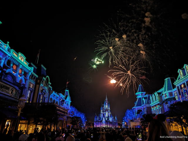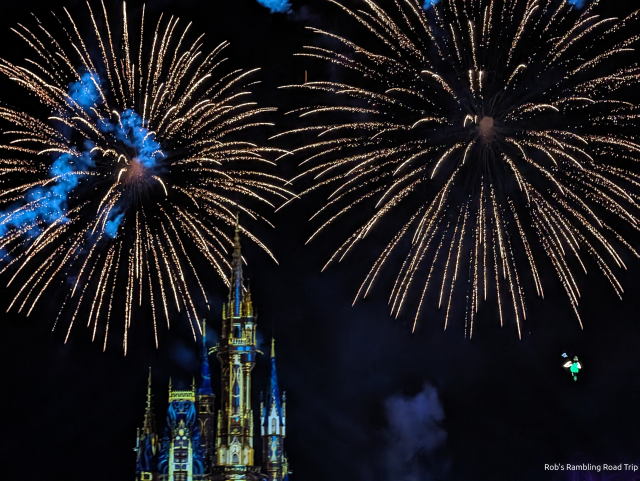 The show was great. There was still enough wind to clear the smoke quickly, but it wasn’t strong enough to stop Tinker Bell. As long as conditions are OK, Tinker Bell flies from the castle during the show. Watching her flight is one of the advantages of watching the show from the front of the castle and on Main Street.