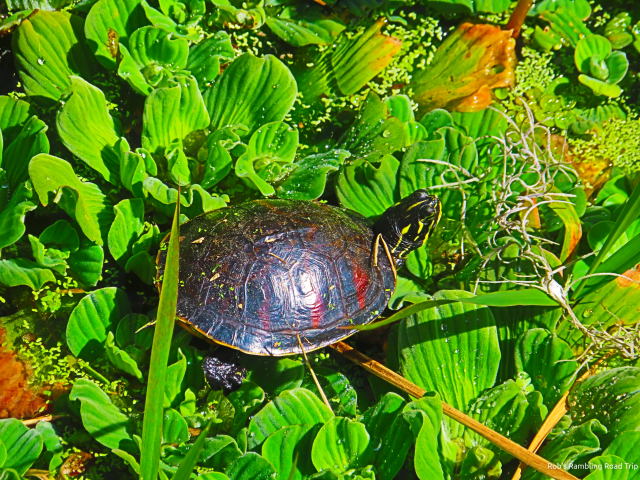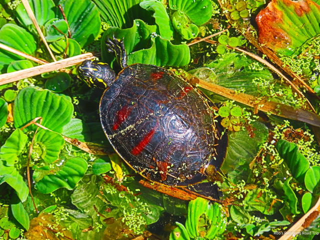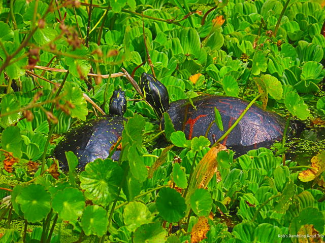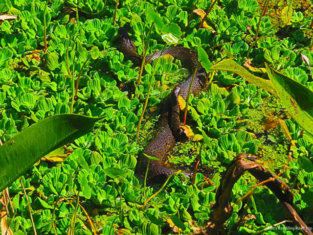 The turtles were in the same location as yesterday. One additional turtle had joined the sunbathing experience. Along with the turtles were two black water snakes. An “expert” looking at the snakes while I was there declared them to be venomous cotton mouth snakes. I have no reason to dispute the identification. All I know is they were black snakes that swam in the water. I am not getting near them either way.