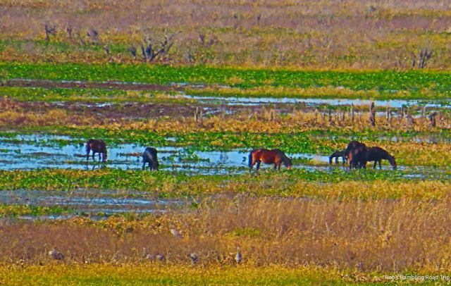 The Cones Dike trail follows the park boundary and prairie edge for the first part of the trail. It is a gravel path suitable for trucks with a couple of square corners. The wild horses were near the first right turn. The second turn is to the left about a half a mile away I’d guess. Between the two turns the area on both sides of the path is filled with water. I spotted five small to medium alligators near the culvert that connects the two sides.
