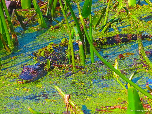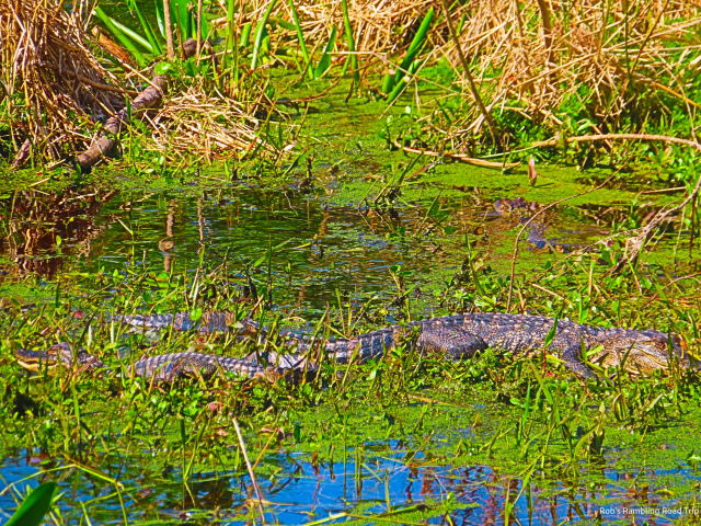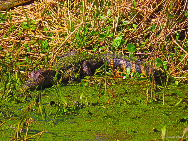 After a few minutes on the observation tower, I ventured along the trail out onto the prairie. Keeping to the trail on the high ground, I walked along the edge of the prairie to an area where the water on the prairie passes under the trail. As is the case elsewhere in the state park, the water level is high on the prairie. Where the water passes under the road, the channel of water is deeper than the general prairie area. There were three young alligators trying to catch some sun.