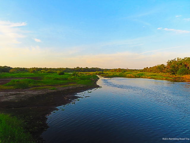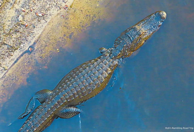 The wildlife on my last walk of the day was disappointing. I walked the three quarters of a mile to the park road bridge over the river. Usually there are still a few gators on the river bank and some birds around. Tonight, just before sunset, there was only one gator almost out of the water. The number of heads in the river was also down. The birds were sparse as well. I still want to see a few deer like I have on past visits.