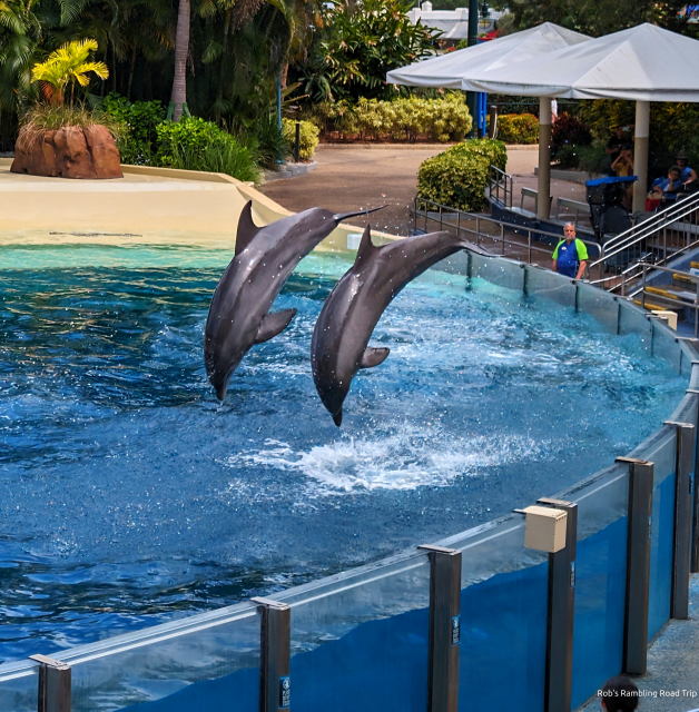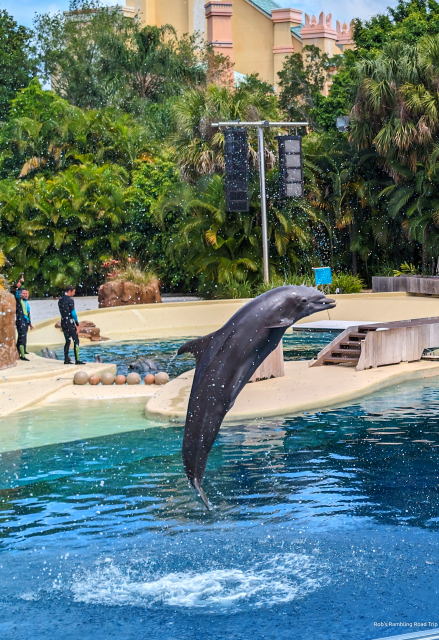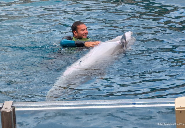My arrival time didn’t match up well with the park show schedule. I only saw the Dolphin show. The times for the Sea Lion and the Orca shows just didn’t line up with my wanderings. The dolphin show was a little different from my last visit in February. I think in the warmer weather the trainers interact in the water to a higher degree. Today three trainers dived into the tank to dance and interact with the dolphins. The dolphin show is always great and today was no exception.