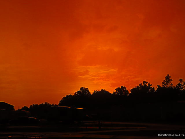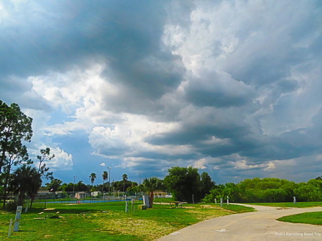 My walk around the RV resort was the full length today. The weather wasn’t threatening and the temperature was cooperating. Once I got Lake Davenport I sat in the one of the Adirondack chairs along the lake shore. After the last few days of heavy storms the water level is high. The lake shows signs of having been out of its bank on the lawn in the recent past. Today it was lapping at the edge of the grass. On the walk to the lake I noted that all of the drainage areas had a little bit of standing water remaining after the last storm about twenty hours prior. I suspect that today’s storms brought them back up to a higher level.
