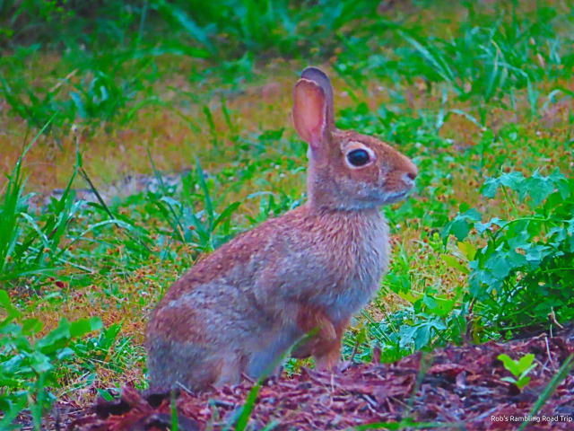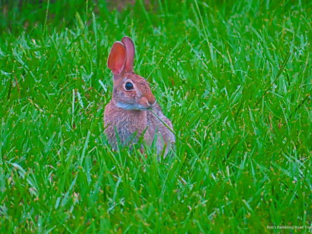 I managed to get in an abbreviated walk around the RV resort this evening. I didn’t want to chance getting stranded on the other side of the park by a roaming thunderstorm. Tonight the rabbits were out in force. I saw at least eight. The ones that froze when I approached got their picture taken. The ones that I startled were saved the “horror” of getting their picture taken.