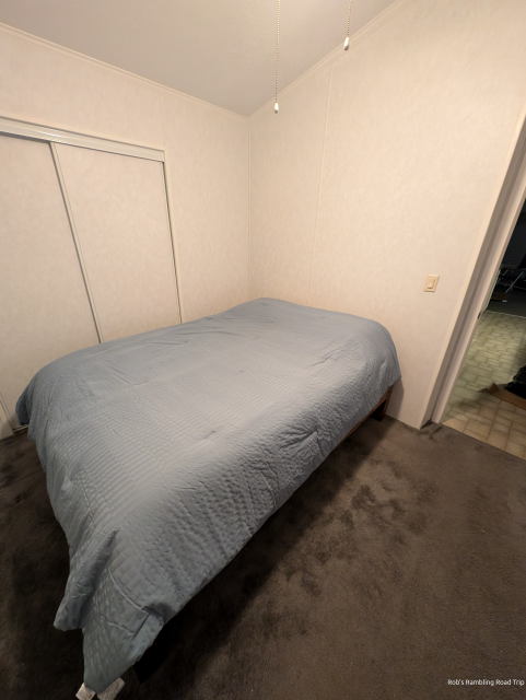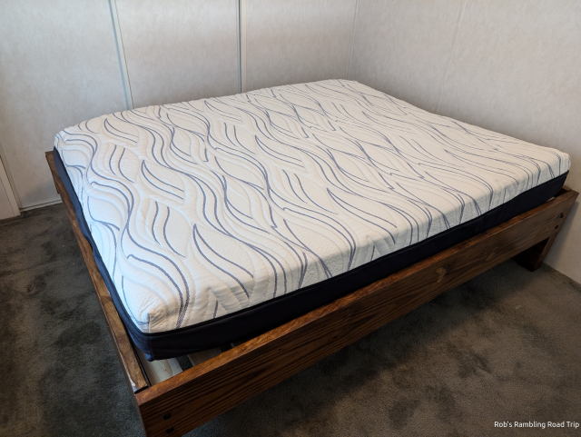 This morning all the parts were complete, stained and coated in three layers of polyurethane. I cleared the blowup bed I’d been using out of the bedroom and carried in each piece of the bed. It took a lot of effort including some extra persuasion to get the pieces assembled. I have created a very heavy bed. Moving it around once it was assembled was a real challenge. The next step was to get the 75 pound Serta Hybird Mattress in a Box onto the bed frame. After I cut the plastic off, it expanded into its mattress shape rather quickly. It is usable now, but it will be 48 hours before it completely expands.